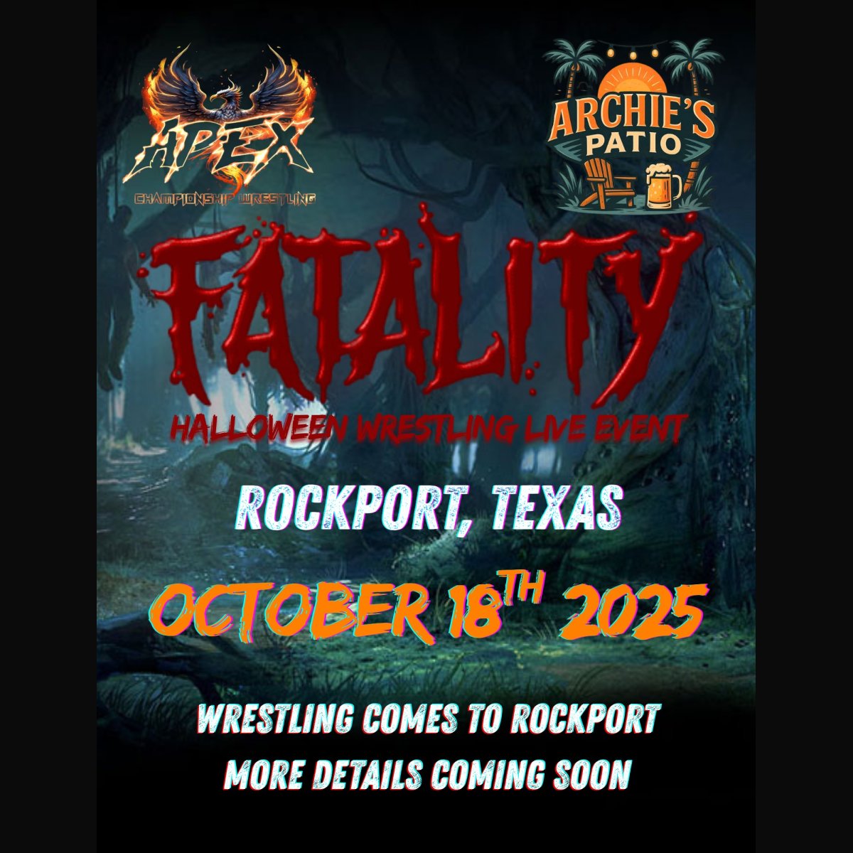 APEX PRESENTS: FATALITY We’re bringing the chaos to ROCKPORT-FULTON, TEXAS at Archie's Patio on October 18th! This is an ALL AGES SHOW – bring the whole family to witness a…